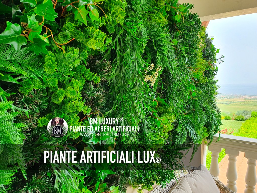 Spettacolare Parete di Giardino Verticale Artificiale LUX™ con piante di altissimo livello estetico e realistico. Le forme, le dimensioni e l’altezza ed i colori della parete Artificiale possono essere realizzate su misura e richiesta del Cliente.