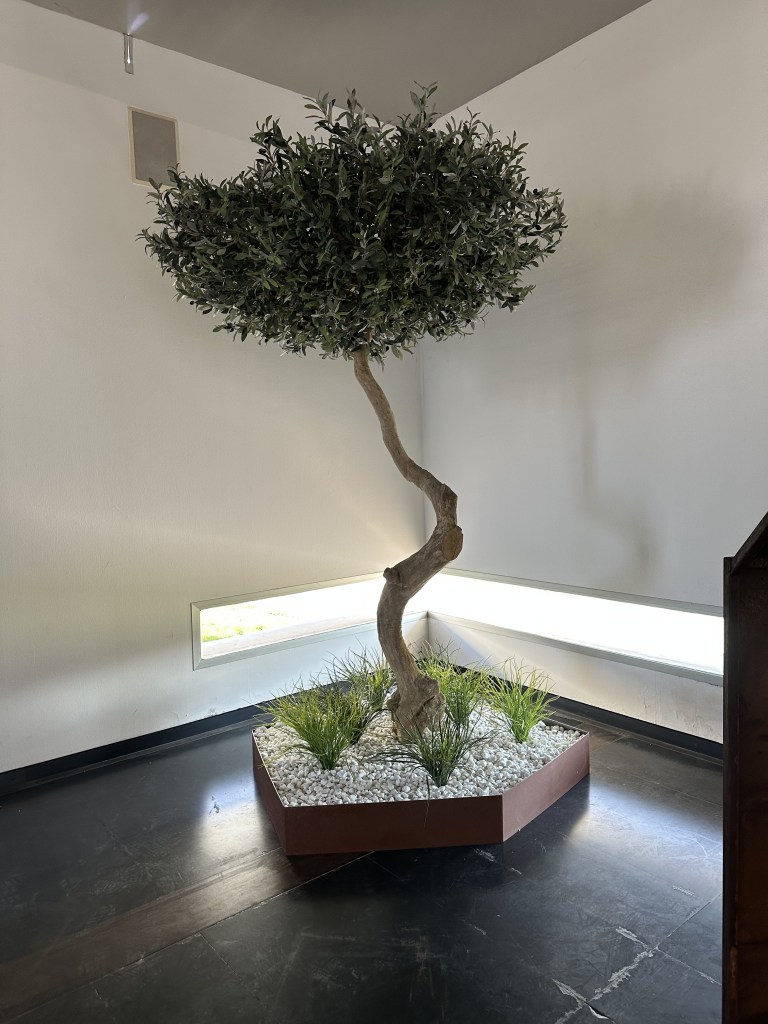 A completare l’allestimento, un unico protagonista vegetale: un magnifico olivo artificiale alto 3 metri, realizzato con un tronco naturale trattato, che conferisce autenticità e carattere all’ambiente. L’olivo, da sempre simbolo di pace e memoria, è stato scelto per la sua forte valenza evocativa, perfetto per un luogo di raccoglimento come il Tempio Crematorio. Le sue chiome rigogliose e la texture realistica delle foglie creano un effetto naturale di grande impatto visivo, senza richiedere alcuna manutenzione.