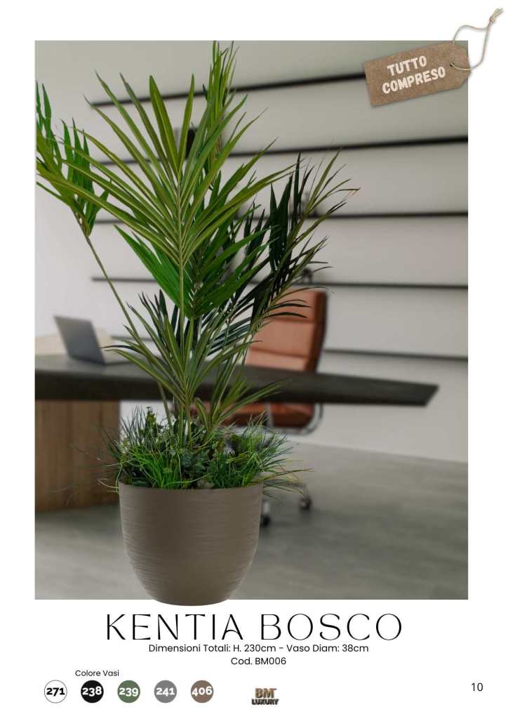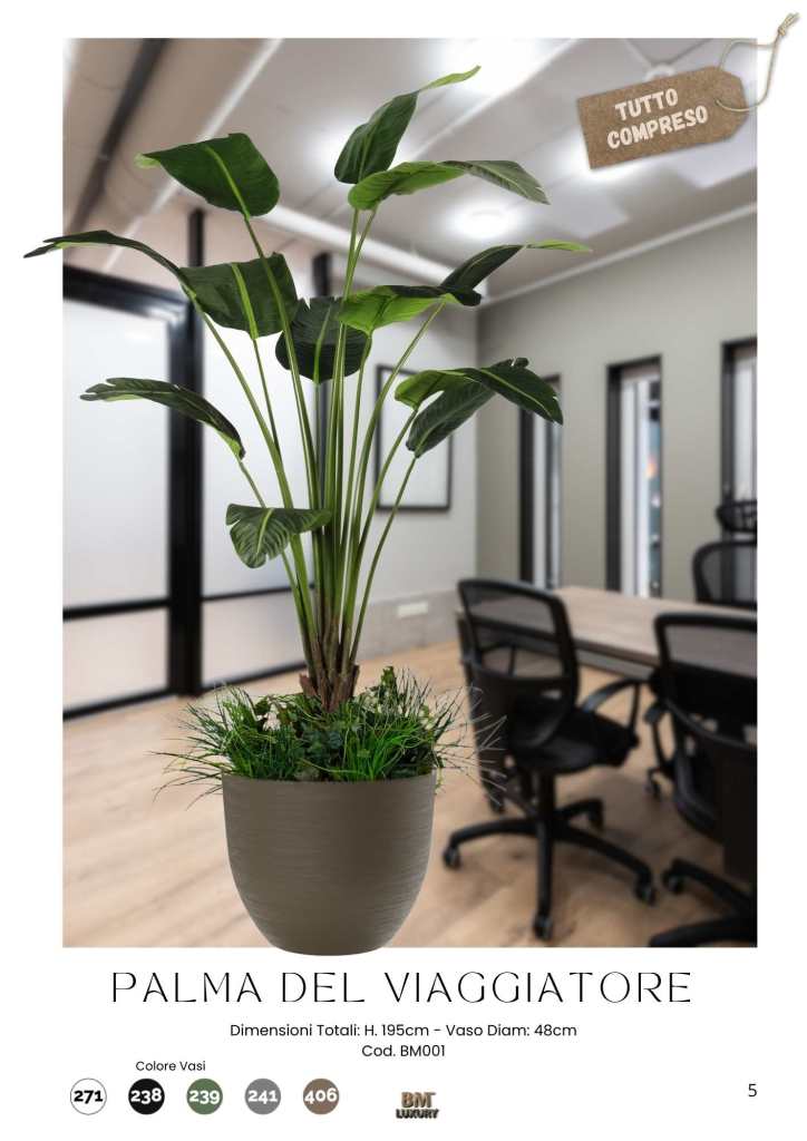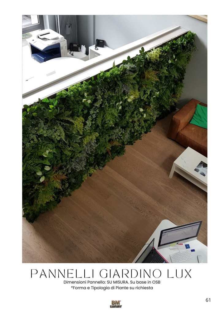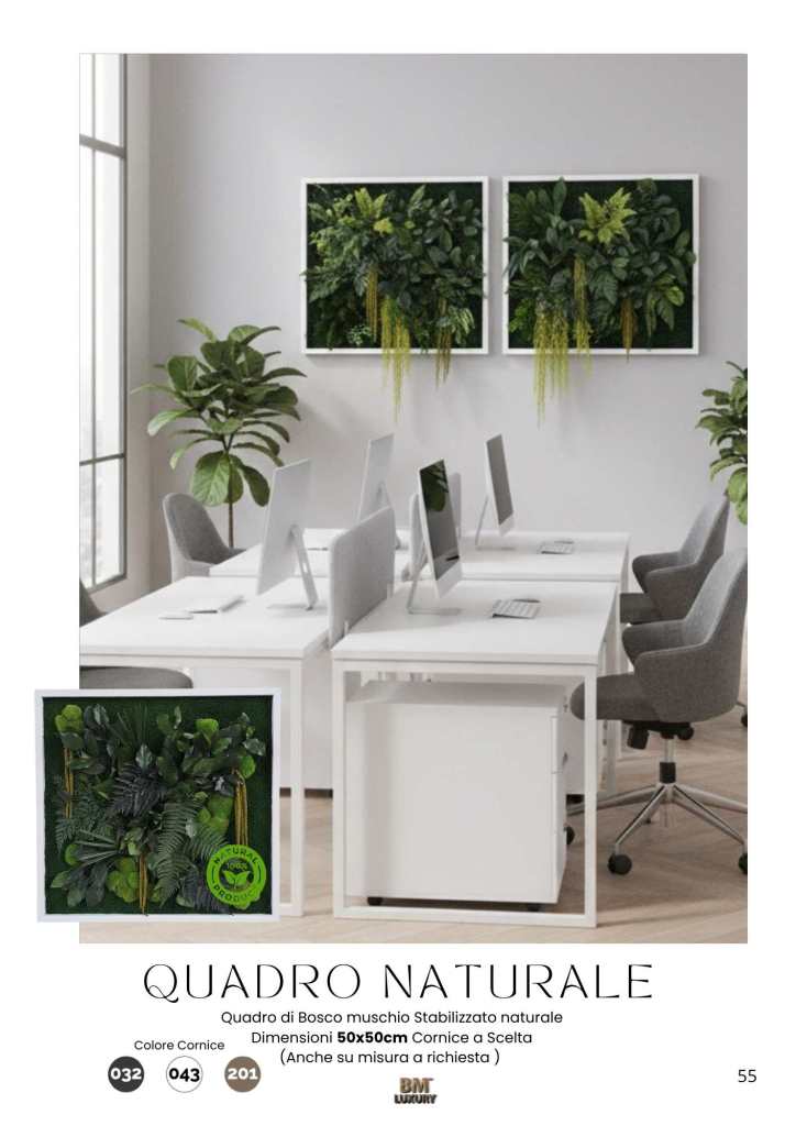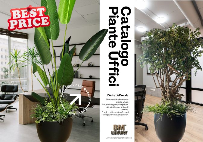Con il nuovo Catalogo UFFICI All Inclusive, firmato BM™ Luxury, puoi portare nei tuoi spazi bellezza, design e benessere, con un solo gesto. Ogni soluzione è pensata per essere pronta all’uso, completa di vaso, accessori, materiali ignifughi e di altissima qualità. Non serve acqua, non ci sono foglie da raccogliere, non si sporca nulla. Zero manutenzione, massima resa.