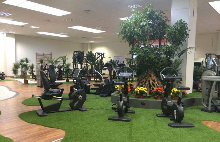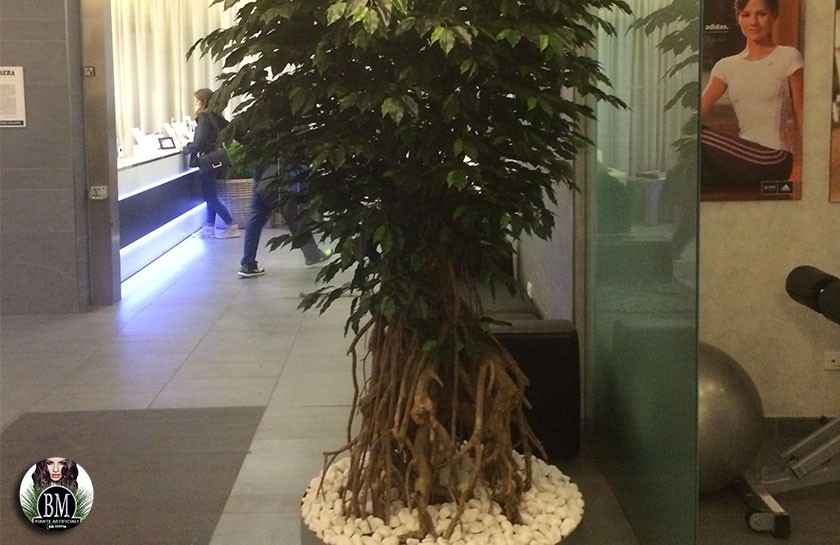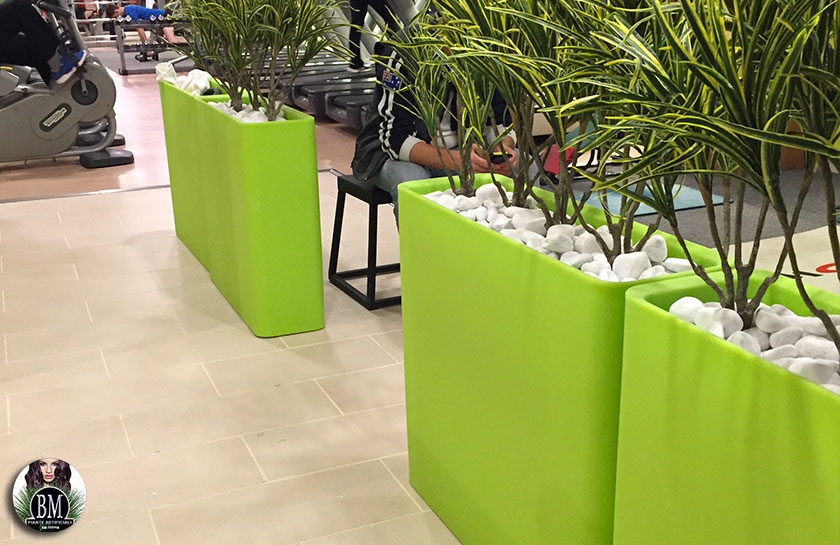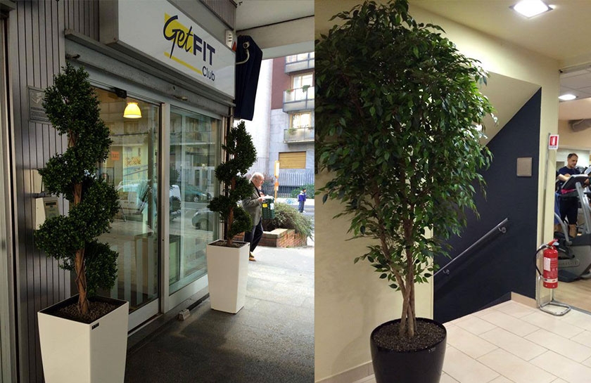 BM arreda Palestra Centro Milano con Splendido Ficus Root, Pianta Bloming Traveller x 2 Flowers e vaso Lechuza, Banano Plant e Decorazione ingresso.